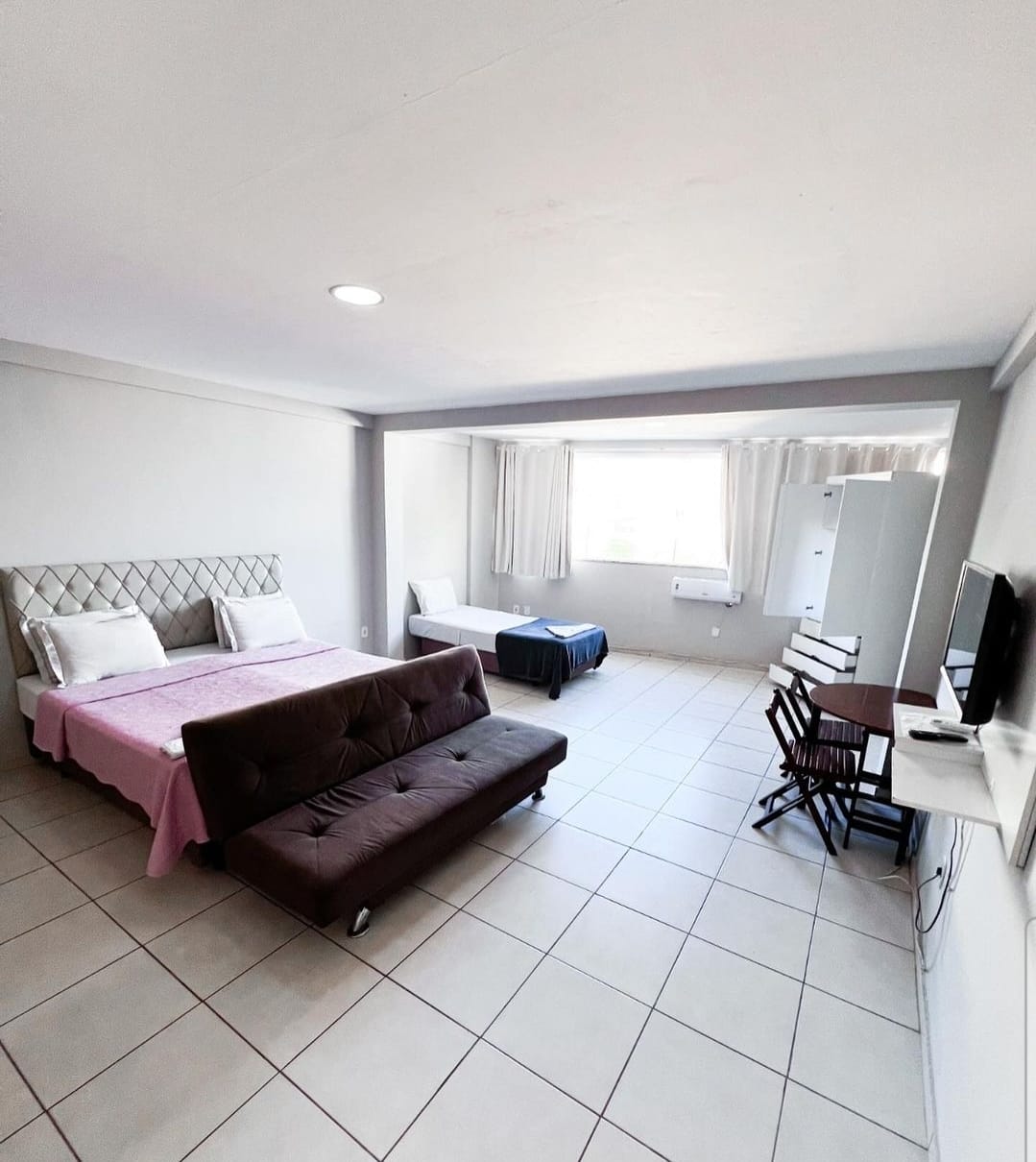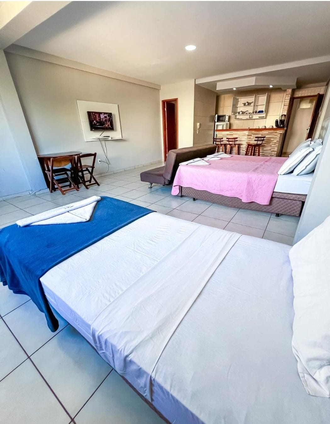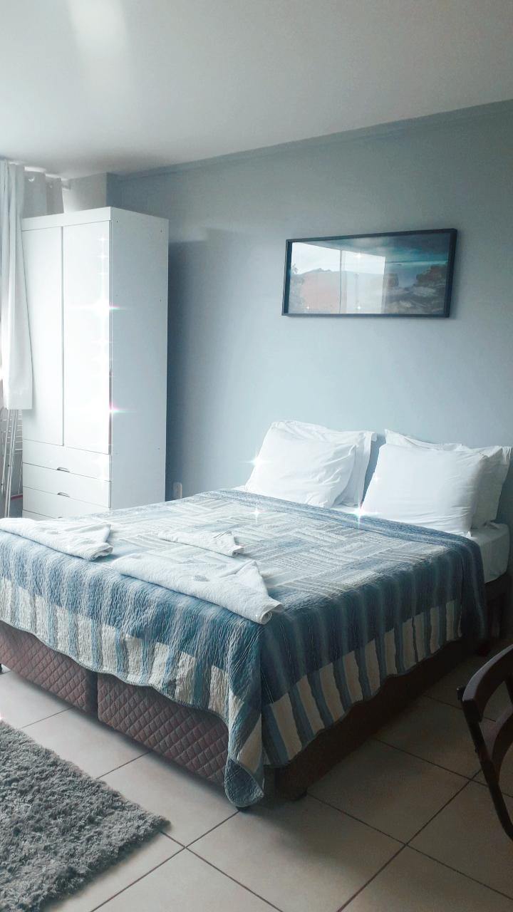 O "Loft superior" é composto por 1 cama de casal, 2 camas box auxiliar de solteiro, 1 sofá cama, armário, geladeira, fogão, ar condicionado, TV de tela plana , cozinha privativa c/ alguns utensílios, micro-ondas, liquidificador, cafeteira, sanduicheira, mesa com 4 cadeiras e banheiro.